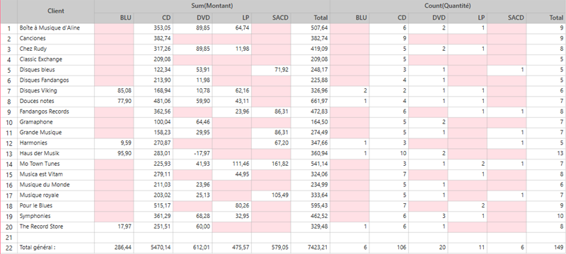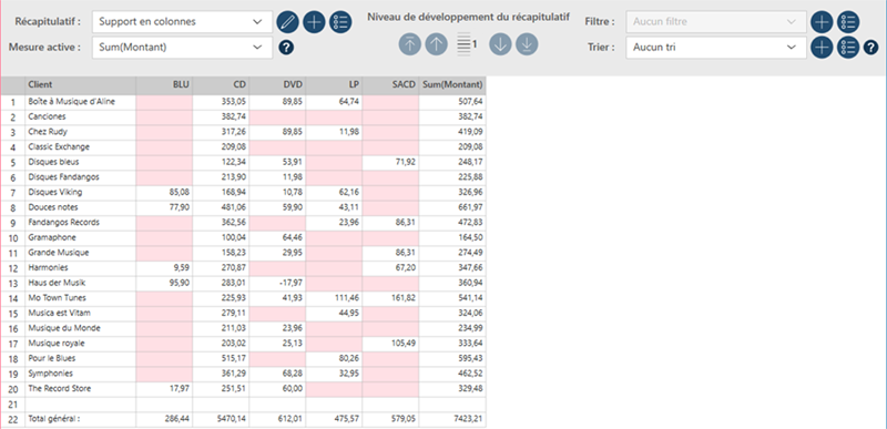 Ces deux vues sont obtenus à partir d’un seul récapitulatif dans lequel Client est défini comme ligne, Support est défini comme colonnes, et Décompte et Montant sont définis comme mesures.