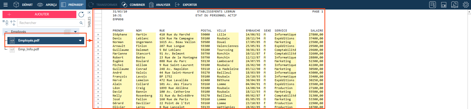 Les documents état ou PDF ouverts dans Data Prep Studio par le biais de la Conception de l’état s’affichent dans la fenêtre Préparer comme des nœuds parent/enfant.