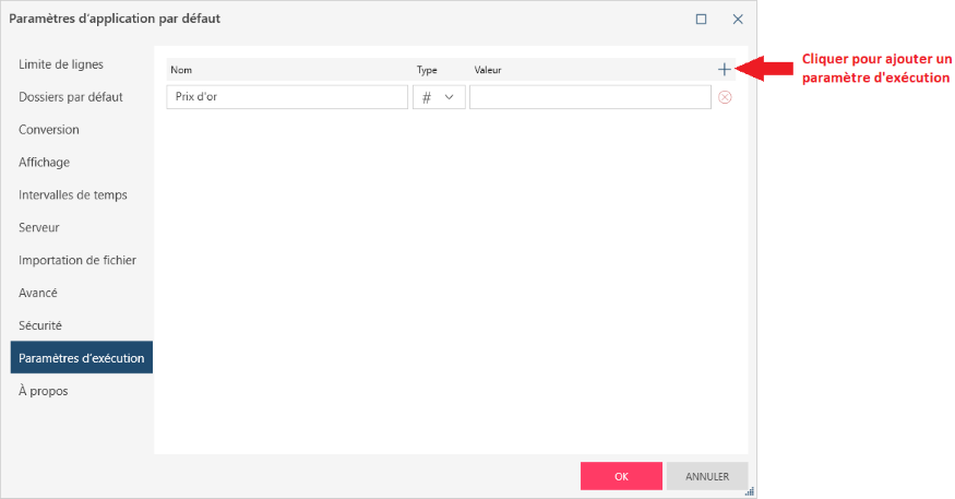 Sélectionnez l’icône + pour créer une nouvelle ligne de paramètre.