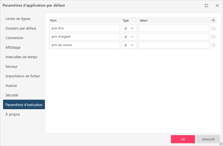 Vous pouvez laisser les valeurs blanches. Dans ce cas, les colonnes créées avec les paramètres d’exécution auront elles aussi des valeurs blanches (ainsi que les champs calculés qui les utilisent). Vous pouvez saisir des valeurs pour les paramètres d’exécution une fois que vous avez ouvert un espace de travail à partir de Paramètres par défaut de l’application ou Paramètres de l’espace de travail actuel.