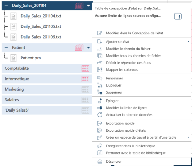 Notez que cette interface est commune à toutes les tables, que la source de données soit un état, XML, JSON, PDF, Excel ou une base de données. Cependant, les menus contextuels peuvent varier légèrement et ces variations sont discutées ci-dessous.