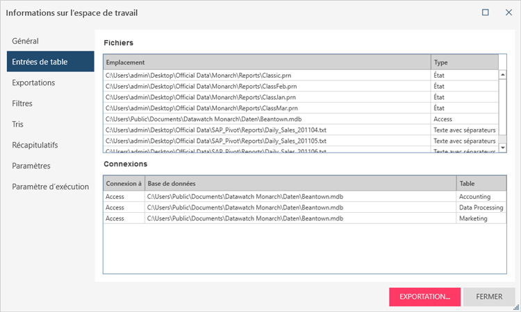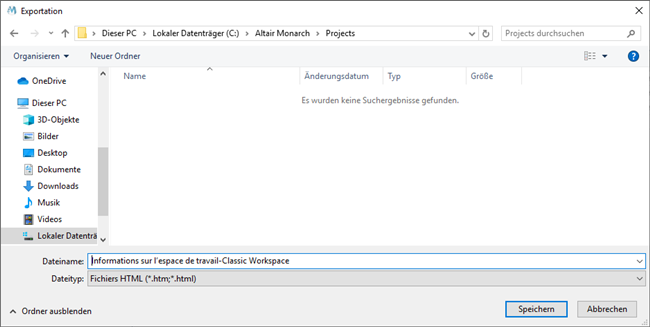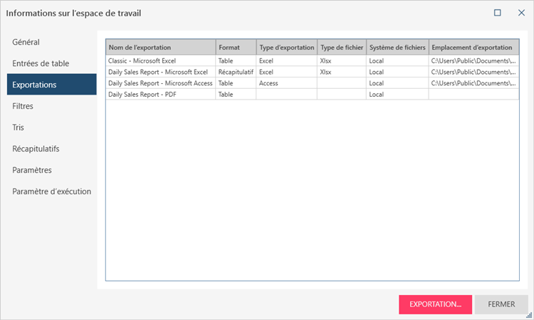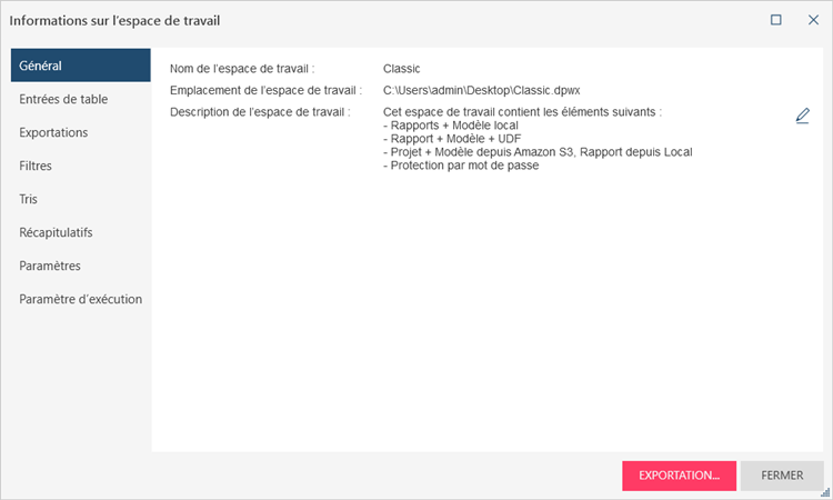 En cliquant sur le bouton Exporter, vous pouvez enregistrer toutes les informations relatives à l’espace de travail dans un fichier HTML.