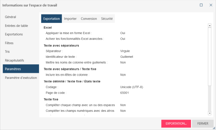 - Paramètres d’exportation, d’importation, de conversion et de sécurité