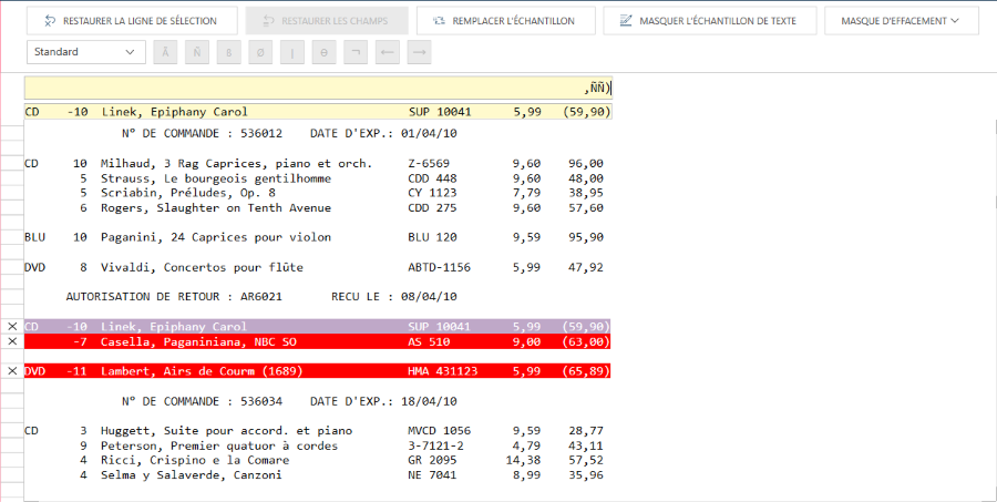 Par exemple, dans la figure ci-dessus, la ligne rouge délimite un masque d’exclusion. Ce masque permettra la capture du numéro de commande et de la date d’expédition de tous les enregistrements, même si ces détails sont sélectionnés à l’aide de deux points.