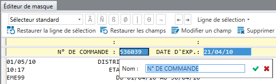 Pour la sélection d'une étiquette de champ, tapez-en le contenu sur la ligne de sélection, juste au-dessus de l'étiquette. Les lettres, chiffres et signes de ponctuation que vous tapez sur la ligne de sélection indiquent à Monarch Classic les caractères exacts à rechercher dans chaque instance du masque. Remarque : Les sélecteurs peuvent respecter la casse. Vous pouvez changer le paramètre de casse par défaut dans la fenêtre Options de saisie (voir plus haut, Paramètre de casse du sélecteur, pour plus de détails). Si vous choisissez de ne pas respecter la casse, la correspondance sera établie dans Monarch Classic, lorsque vous tapez « date_d’exp. », par exemple, avec les formes « Date_d’exp. » et « DATE_D’EXP. » de l’étiquette.