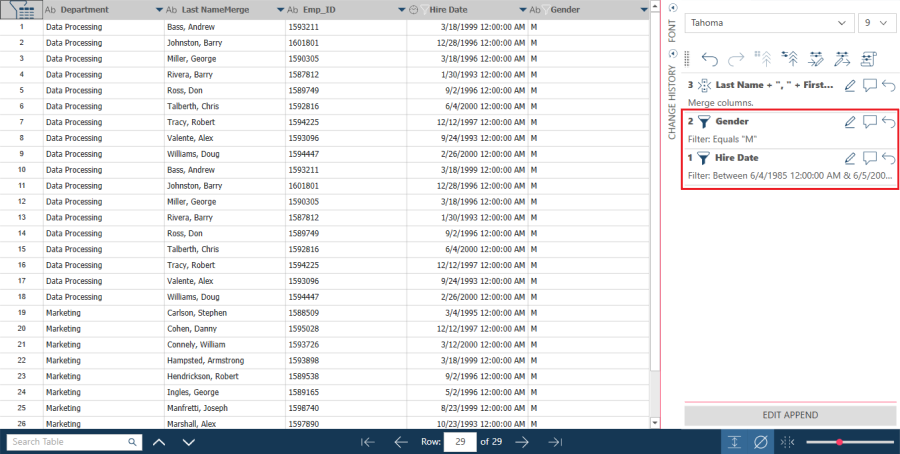 Editing filters via the Change History panel