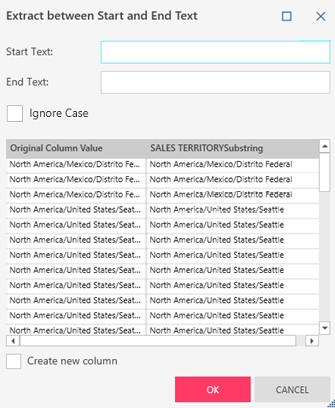 In this example, SALES TERRITORY is the original column. We start extracting after the string / and end on the string / to obtain the column SALES TERRITORYSubstring.