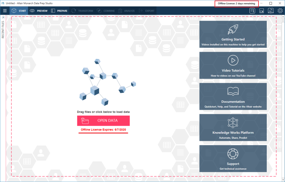 When your Monarch installation is licensed via a License Server instance, you will require an internet connection each time you work with the application. If, for example, you are travelling and have no reliable access to the internet, you may check out your license and use Data Prep Studio offline.