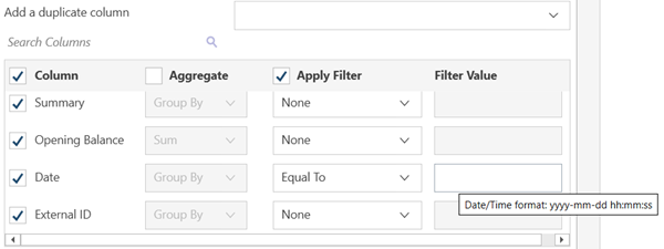 Note: If you wish to add a duplicate column, select this column from the Add a duplicate column drop-down list provided. To Select a Column Check the boxes beside the columns you want to use. If you want to use all columns check the Column box on the header. To Aggregate Columns