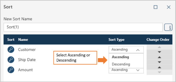 Once you have populated the sort columns list, define the sort type of each selected column by selecting Ascending or Descending from the Sort Type drop down beside each sort column.