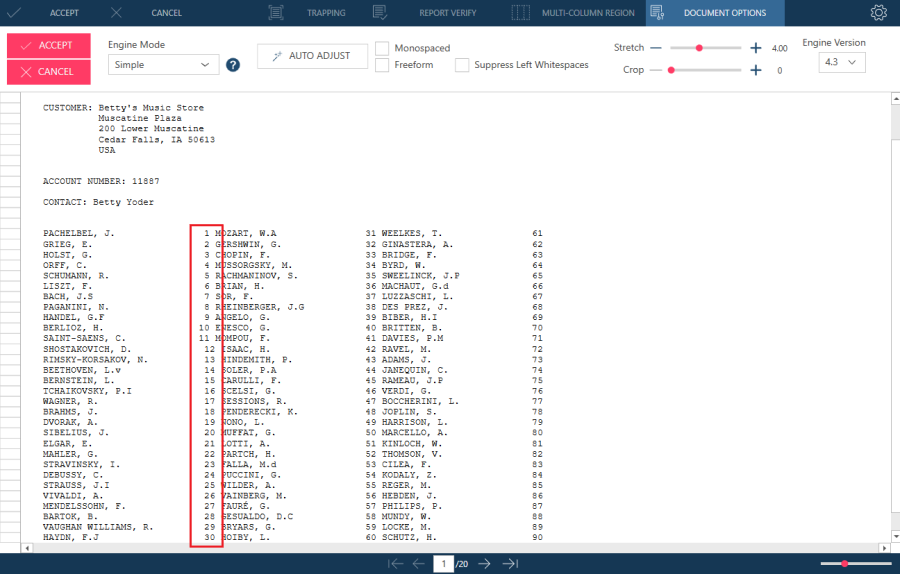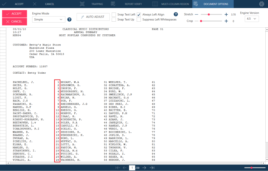 For example, when the PDF report Composers.pdf, which is usually available in C:\Users\Public\Documents\Altair Monarch\Reports, is opened in Data Prep Studio and an older PDF engine is used (e.g., 4.3), the second column appears skewed.