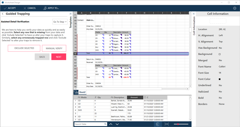 Samples of trapped data are displayed on the preview grid (the panel below the worksheet).