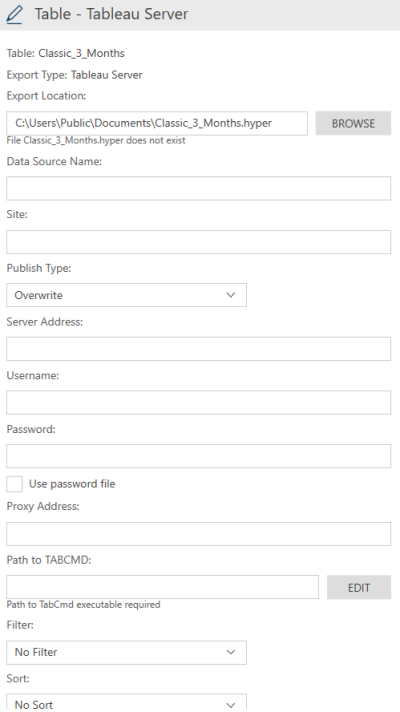 Note that, to enable successful exports to Tableau Server, you also need to have installed the Tableau TABCMD program. TABCMD is a command-line utility that allows users to automate administrative tasks on your Tableau Server site. Click here to download and learn more about the utility.