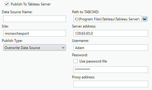 Monarch Classic supports exports to and updates of existing worksheets in Tableau Server. Access to Tableau Server may be configured through the Security tab of the Options window.