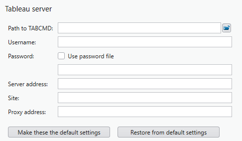 The information you entered to access Tableau Server in the Security tab of the Options window displays. If you did not provide the necessary information in this tab, you can do so now.