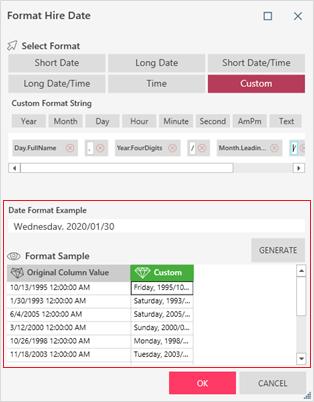 To define a custom date format by example, enter a sample custom format into the Date Format Example field. Click the Generate button to produce a sample of what your dates/times will look like when your selected formatting is applied. The format you specified is also added to the Custom Format String field.
