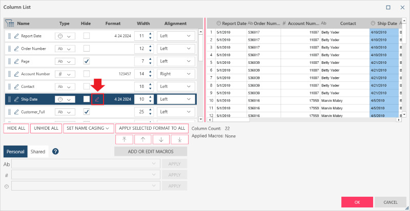 Select OK if you are satisfied with the new formatting. The Format dialog closes and you are returned to the Column List dialog.