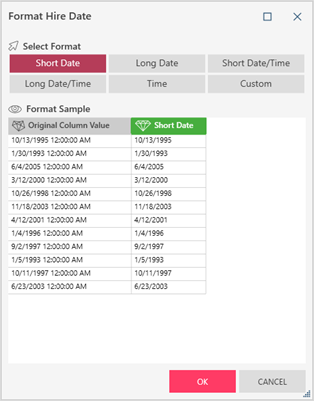 Select a pre-defined date format (Short Date, Long Date, Short Date/Time, Long Date/Time, Time) to apply these formats to your date columns. Alternatively, select Custom to enter your own custom formatting: