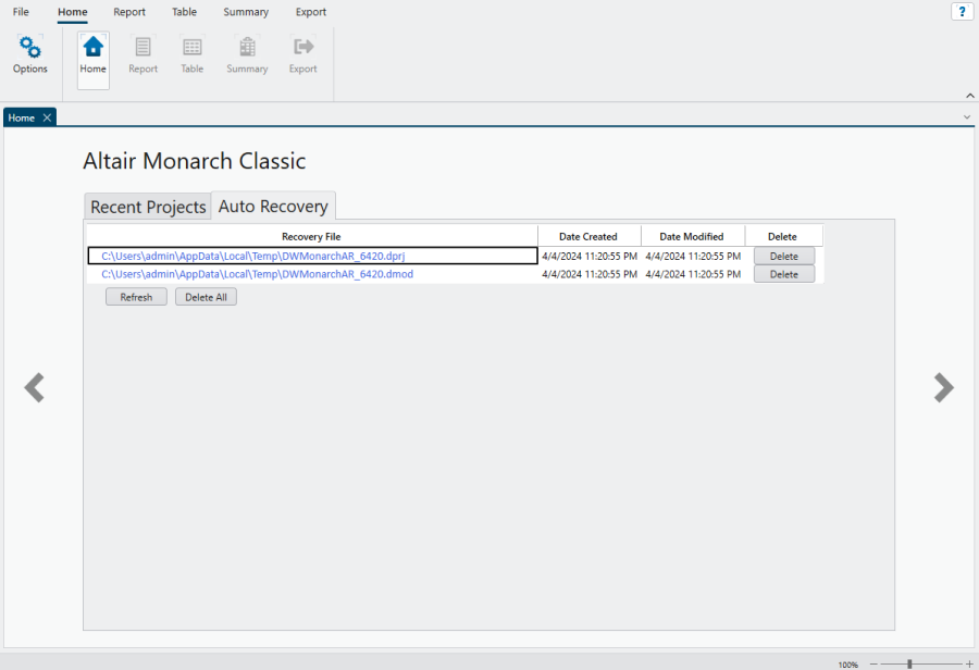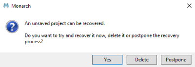 Monarch Classic provides a setting that enables you to automatically recover the last model and project you accessed if the service is accidentally terminated or the application crashes. This setting is found in Options > Advanced > Auto Recovery.