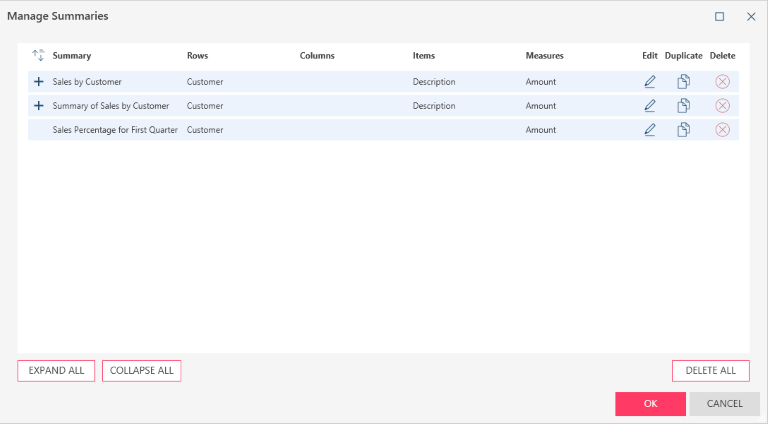 Once created, you can view the properties of your summaries, including the rows, columns, and measures the contain, edit them, duplicate them, or delete them. These are done via the Manage Summaries dialog.