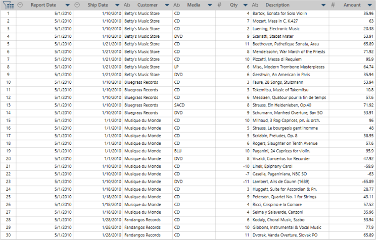 Key fields are used to define the summary matrix. For example, the summary in Figure 3 uses the Media field as the key field. Monarch Data Prep Studio examines the field, creates a list of all unique values (BLU, CD, LP, SACD, and DVD) and then uses these values to create the summary matrix.