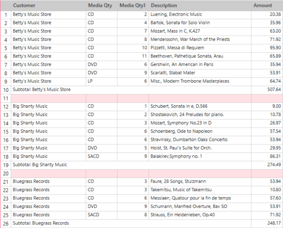 The summary in Figure 5 includes the Customer, Media, Quantity, and Description fields as key fields and the Amount field as a measure. This summary displays individual transactions for each media type within each customer. Subtotals are generated at both the Media level and the Customer level.