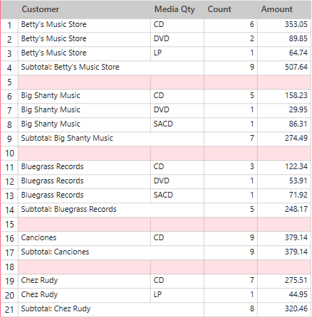 Figure 4. Sales broken down by customer and media type. The COUNT column displays the number of transactions and the Amount columns display the total dollar sales for each key.