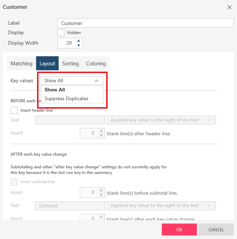 In the Layout tab, use the Key Values drop-down to select Suppress Duplicates.