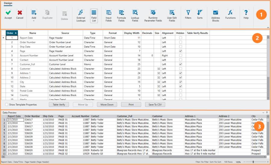 Ribbon Displays all the tools you need to work with a report template. Refer to the Table Design Ribbon Quick Reference. |
