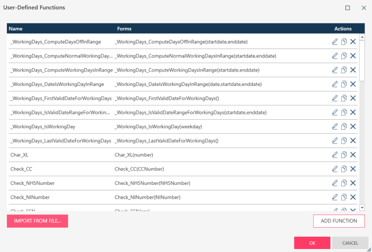 The User-Defined Functions dialog displays. This dialog contains a list of all user-defined functions available for use in your workspace as well as their form. You can edit, copy, and delete any of these functions by selecting the appropriate button under the Actions column. You can also add a function from this dialog or import functions from a model or workspace file.