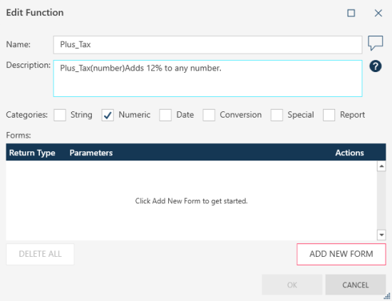 in the Functions column. The Edit Function dialog displays. - Supply a name for your function as well as a description for it. Adding a description will help other users understand what the function is for. You can enable syntax highlighting for parameters by using HTML-style tags. For example, if your function has the form "YearsBetween(startdate,enddate)," you could format your description as "Returns the number of years between <1>startdate</> and <2>enddate</2>."