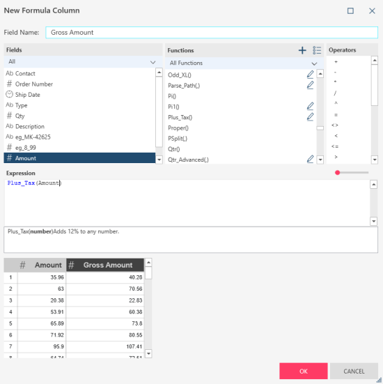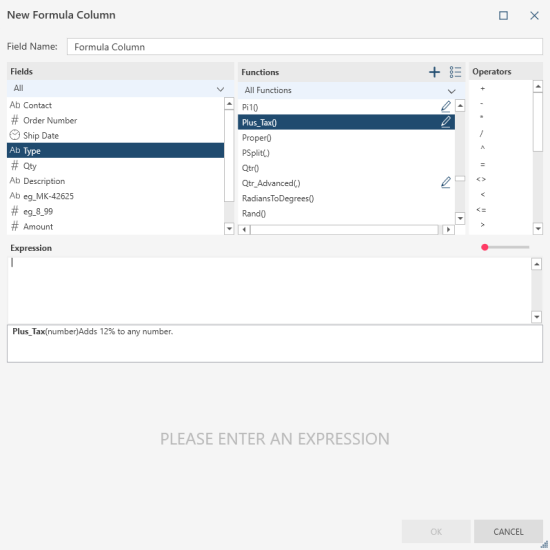 - Build the function in the Expression box. For example, if you wish to calculate any the gross amount of any number net of 12% tax rounded to two digits, you could create the expression "Round(Abs(Number1)+(0.12*Number1),2)."