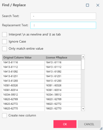 When you apply this operation, you are first asked to set the string to replace and the string to replace it with. Select the Ignore case checkbox to instruct the application to ignore the case of the text to replace. If you wish to perform the replace operation only when the search string matches the entire value in the original column, select the Only match entire value checkbox.