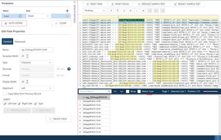 Due to the consistent placement of data within the report, defining a trap to capture each occurrence of any one of these fields would be quite easy. With some reports, however, a standard trap won't work because data placement within them is irregular rather than consistent. In the report below, for example, note how the date/time fields (e.g., 23/Aug/2008:...) begin at different horizontal positions.