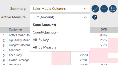 The following examples show a single summary in which all measures are viewed by key and by measure. Similarly, for this summary, Customer is defined as a row, Media is defined as columns, and Amount and Quantity are defined as measures.