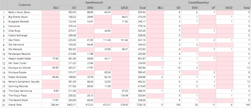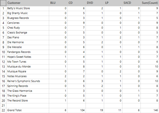These two views are obtained from a single summary in which Customer is defined as a row, Media is defined as columns, and COUNT and Amount are defined as measures.