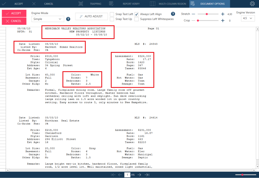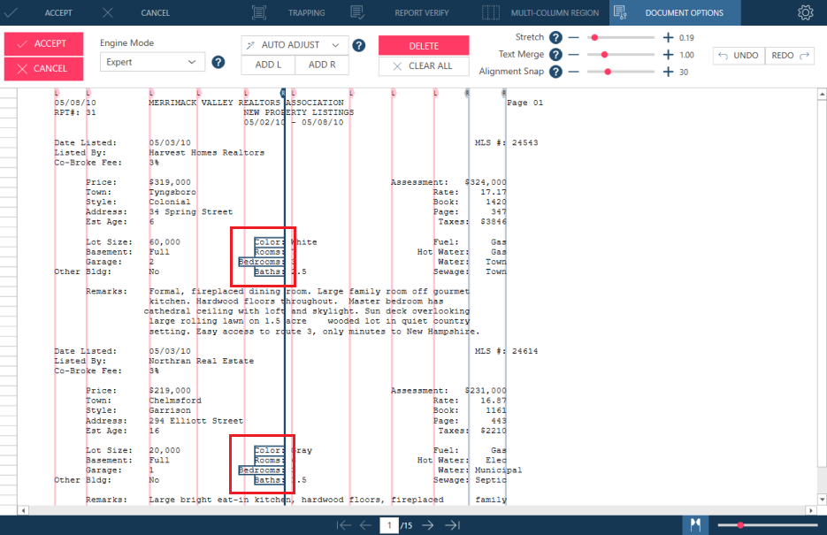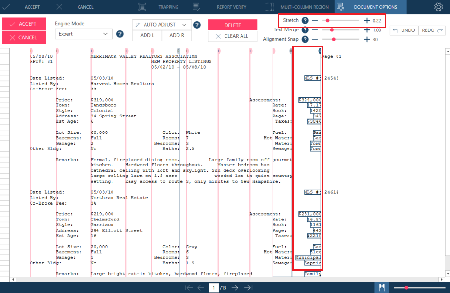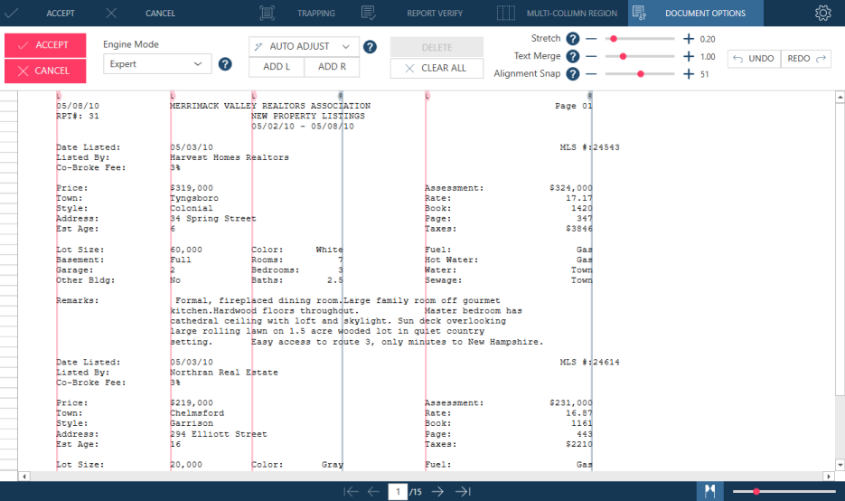 The Expert engine mode focuses on producing text that is vertically aligned into columns as consistently as possible by providing manual control over the alignment of closely positioned groups of text. This mode can be used when the settings available under the Simple engine mode are insufficient to produce a well-aligned report (e.g., the PDF file contains numerous instances of different font sizes throughout its pages). The following table describes the properties that can be modified under this mode.