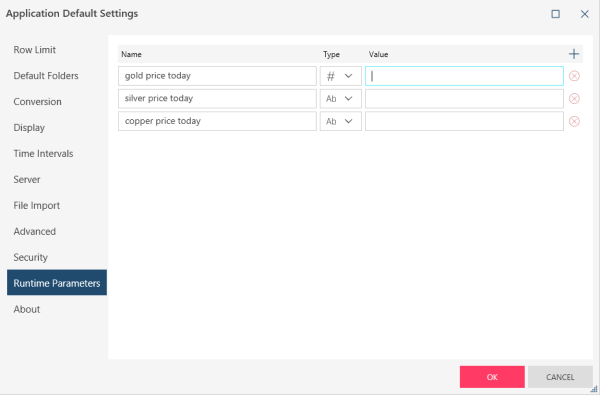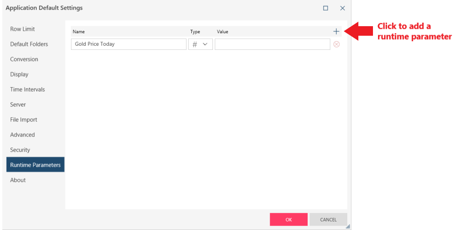 Runtime parameters are user-defined fields whose values are requested when a workspace is loaded. Runtime parameters allow you to enter a value that is not contained in the data source and whose value may only be known at runtime, such as today's exchange rate. You can add runtime parameters as a new column to a table while preparing your data if you wish.