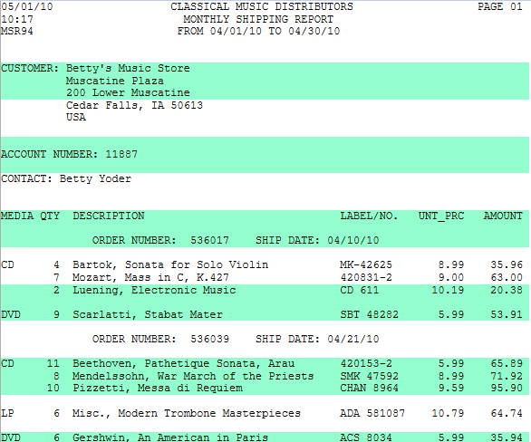 When displaying a report in the Report window, Monarch Classic's greenbar feature provides a representation of greenbar paper, with alternating areas of green and white background. This feature is useful for viewing sparse reports because the greenbar shading helps your eye track across each line.