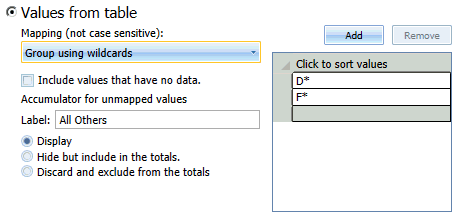 Group using wildcards works almost like Exact match, but in this case you can use wildcard characters to specify the key values to include. In this way you do not have to enter all values exactly.