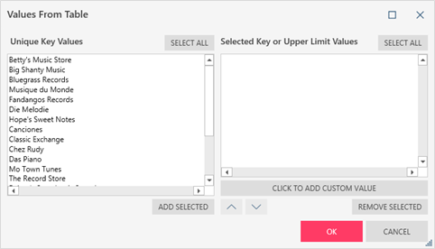 Select a value or all values from the Unique Key Values panel and then click Add Selected.