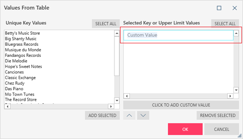 Enter a value directly into the Selected Key or Upper Limit Values panel by clicking on the Click to Add Custom Value button, double-clicking on the Custom Value key and then entering a new value.