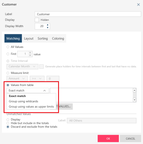 Using Exact match, you only group according to the key values that are listed. In the example above, you only group according to the four customers listed.