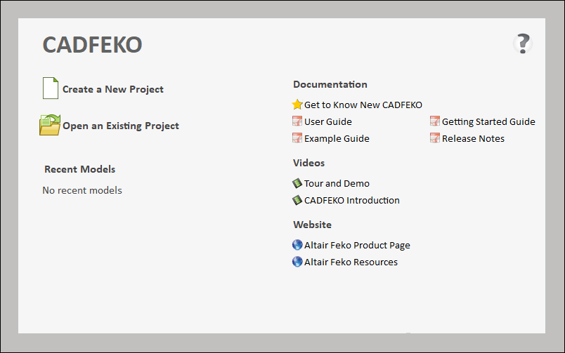 The Feko start page is displayed when starting a new instance (no models are loaded) of CADFEKO, EDITFEKO or POSTFEKO.