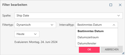 Um einen dynamischen Filter zu definieren, wählen Sie den Intervalltyp (Bestimmtes Datum, Datumszeitraum oder Datumsfenster) aus und erstellen Sie dann den Filterausdruck, indem Sie einen Operator und den gewünschten Datumswert auswählen: