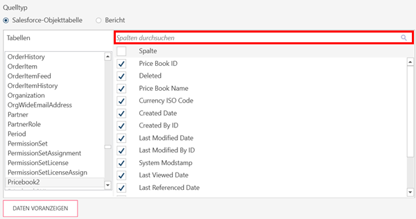 Beachten Sie, dass Salesforce den Erwerb von Berichten auf 2000 Detaildatensätze beschränkt. Nach der Auswahl eines Quelltyps wählen Sie die Daten aus:
