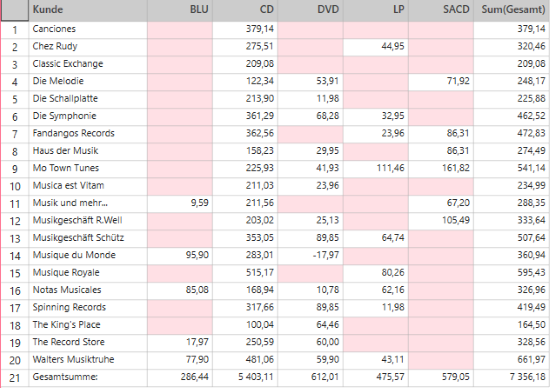 In diesem Fall wurden sechs Datensätze für „Die Melodie“ mit CD-Verkäufen, zwei Datensätze für den gleichen Kunden mit DVD-Verkäufen, und ein Datensatz für einen LP-Verkauf.