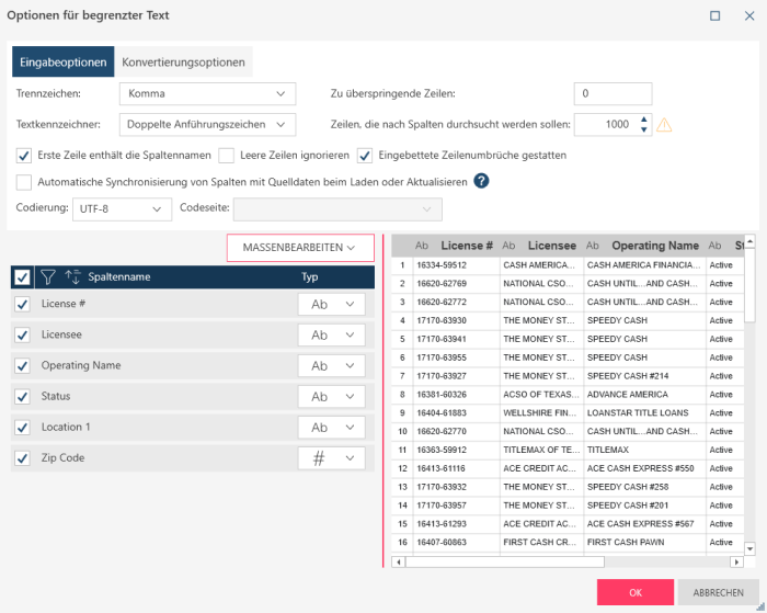 Hinweis: Jeder Spalte in der Datenquelle mit durch Trennzeichen getrennten Textdateien können bestimmte Datentypen zugewiesen werden, indem Sie die Dropdown-Listen Typ rechts neben den einzelnen Spalten verwenden.