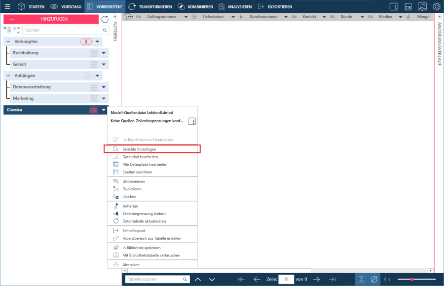 Klicken Sie im Fenster „Vorbereiten“ mit der rechten Maustaste auf eine Tabelle, die Sie in einen Arbeitsbereich exportieren möchten, und wählen Sie dann Arbeitsbereich aus Tabelle erstellen aus den angezeigten Optionen aus.