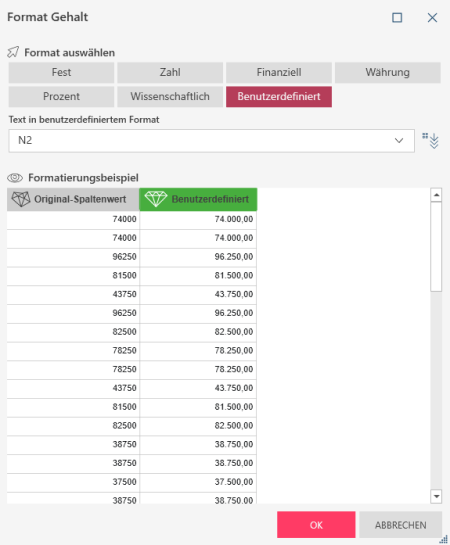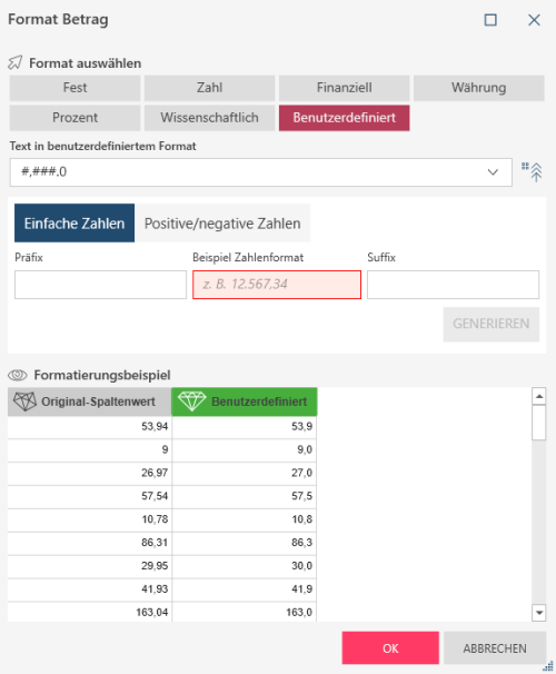Wählen Sie eines der vordefinierten Formate(Fest, Zahl, Finanziell, Währung, Prozent, Wissenschaftlich) aus, um diese Formate auf Ihre numerischen Spalten anzuwenden. Sie können auch Benutzerdefiniert auswählen, um Ihr eigenes benutzerdefiniertes Format einzugeben: